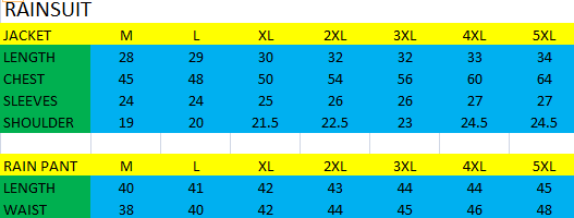 Shirt pant with cap and pouch, high quality zips, water proof fabric , water repellency coating on the fabric , non toxic fabric, Bright yellow Color..
